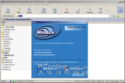 软件简介:绝对强悍压缩和解压缩程序,功能及支持格式相当齐全,功能方面包括压缩与解压缩之外、还有分片压缩、加密功能、支持鼠标右键快显功能,建立自动解压缩等,支持的格式丰富另WinACE可预设压缩及解压缩路径、编辑程序、扫毒程序等。同样的没有官方简体中文版,有网友制作的汉化版。