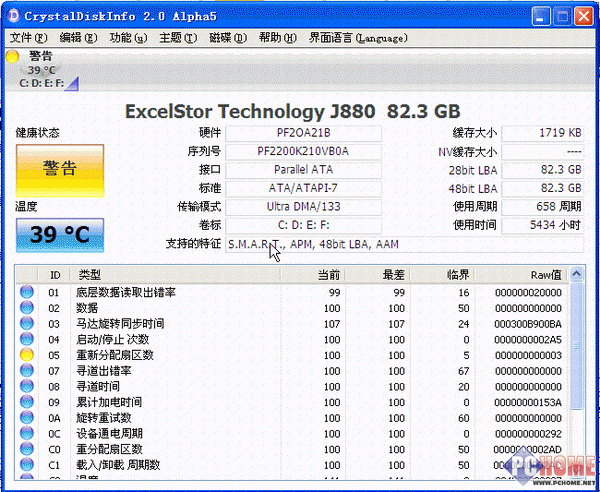 CrystalDiskInfo启动后,软件将自动根据系统语言显示对应的界面,其中包括简体中文。同时也将自动完成对硬盘的检测,并显示相关数据信息,如硬盘主要参数、S.M.A.R.T各项参数与属性等。在主界面左上角则明显的显示硬盘当前温度和状态(如图,根据S.M.A.R.T的规定,健康状态一般有正常、警告和报告故障或错误这3种状态,目前小编的为‘警告’状态),这是CrystalDiskInfo针对前面的各项属性值进行比较分析后,提供的硬盘各属性目前的状态,也是我们直观判断硬盘“健康”状态的重要信息。