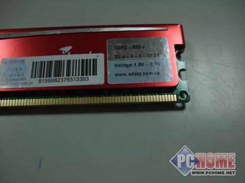 红色威龙极速DDR2 800+采用专业的6层PCB板,优化的走线设计,由于散热片的遮挡不能看到其内部颗粒,不过通过图片可以看到其金手指,相信这款内存在做工和质量质量上的都可以有很好的品质保证。