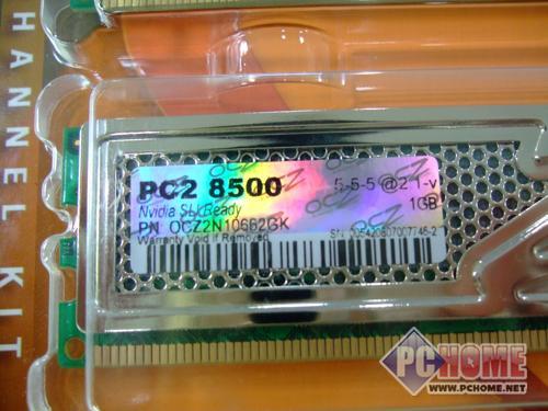 从内存标签上我们可以看出这款内存频率为1066MHz等效于PC2 8500,型号为OCZ2N10662GK,单条容量1GB,时序5-5-5,工作电压2.1V,并印有Nvidia SLI Ready字样。