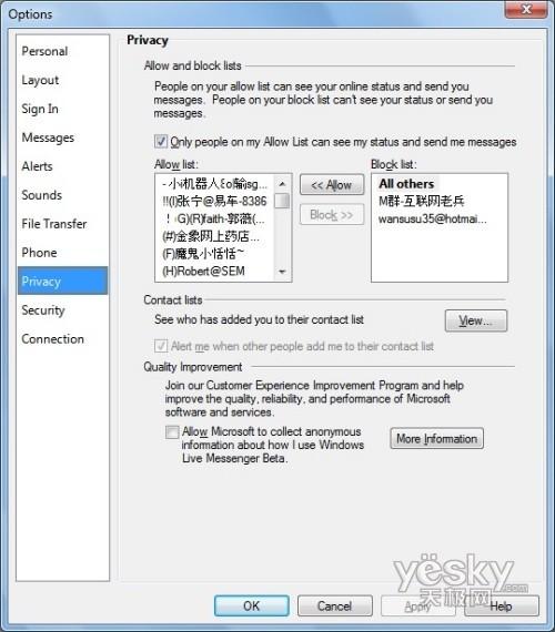 Windows 7中Windows Live Messenger阻止联系人界面