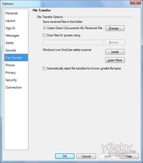 Windows 7中Windows Live Messenger文件传送设置界面
