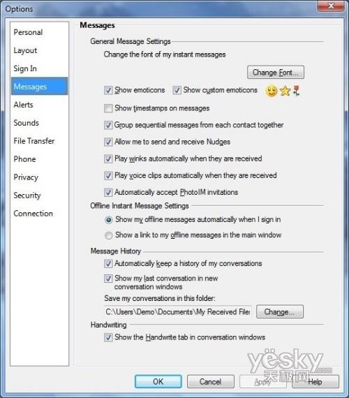 Windows 7中Windows Live Messenger消息设置界面
