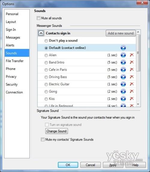 Windows 7中Windows Live Messenger声音设置界面