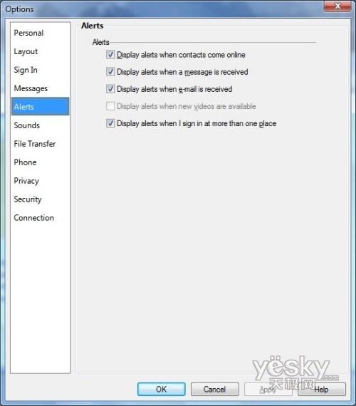 Windows 7中Windows Live Messenger提示设置界面