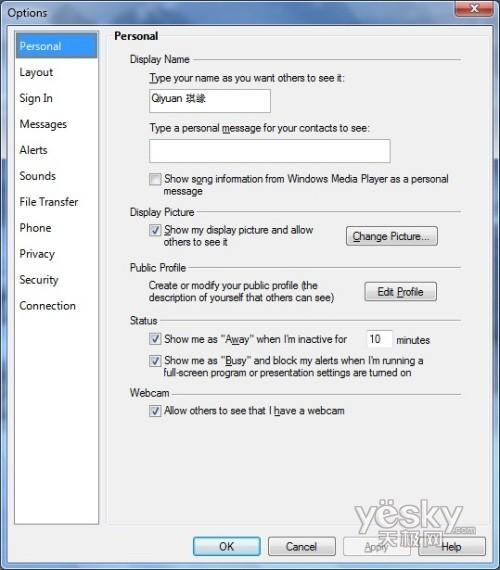 Windows 7中Windows Live Messenger个人信息设置界面