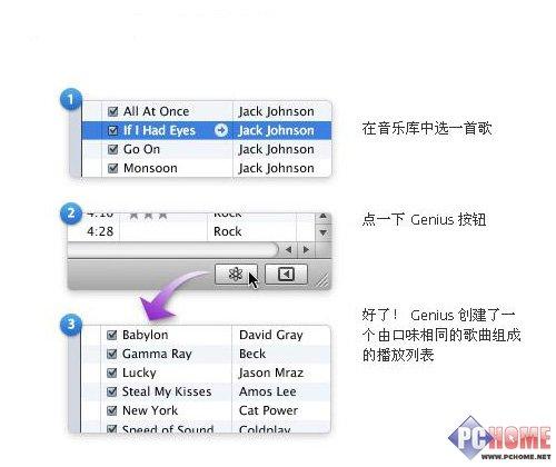 如上图所示,按照1~3的步骤,Genius会根据你所选择的该首歌曲创建一个由风格相同的歌曲组成的播放列表,操作是十分简单的,Genius的出现也解决了不少个人对播放方式上的个性需求。