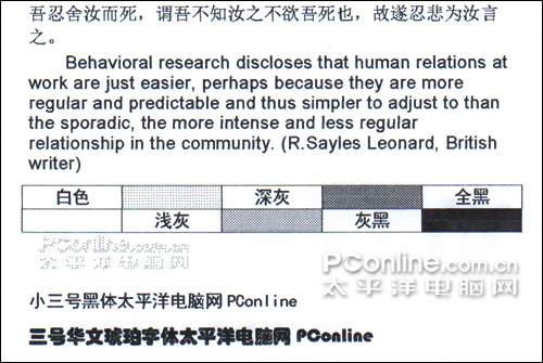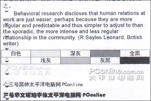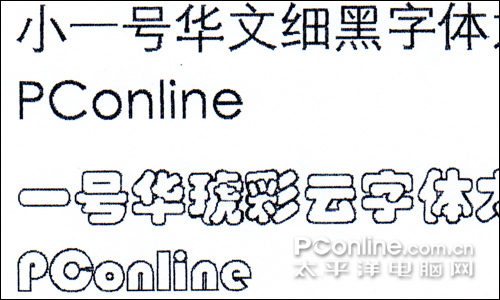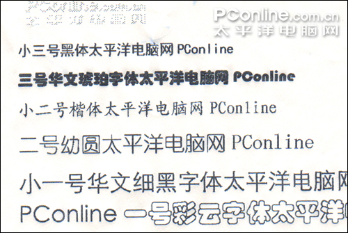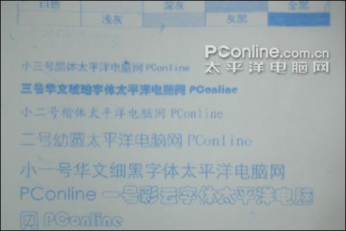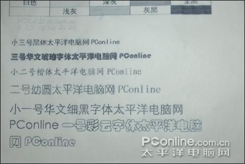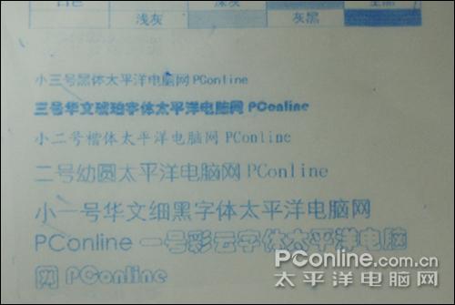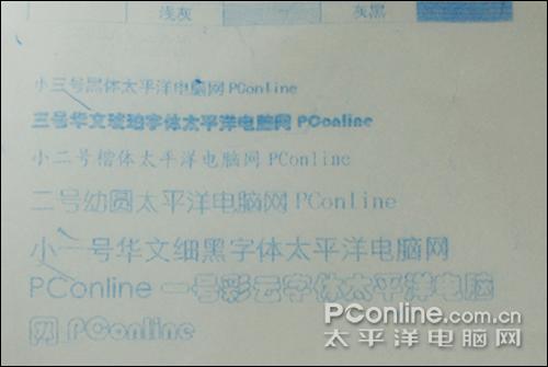 放大样张可以看出,华文彩云字体的边缘效果略微不平滑,有针打点阵的痕迹,但并不影响整体字符的效果,整体颜色较深,效果不错。