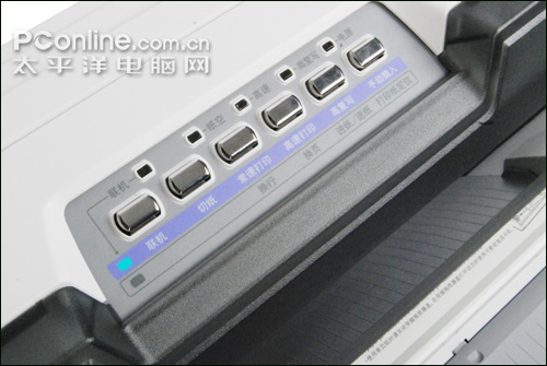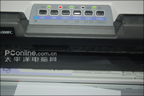 6300FC控制面板采用金属质地,设计详细直观,上下一共分为两行菜单,六个控制按键构成了主要的控制面板,这区别于其他4个控制按键的针式打印机。面板的第一行为联机、纸空、高速、高复习和机器的状态指示灯,代表机器工作的状态。用户可以在第二行控制面板上完成打印任务中的换行/换页、进纸/退纸、和切纸、自动寻边、自动纠偏等功能。简单流线的面板设计极其人性化,6键式的界面语言方便人机交换,能满足行业打印用户的多种个性化需求,即节省了时间,又大大降低了错误操作率。