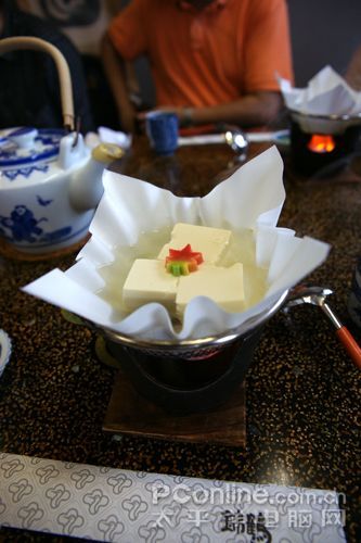 中午吃饭,日本料理中的盒食。开始时上来一个纸火锅,里面放着豆腐,然后半天没上别的菜,于是我们猜想是否日本人吃饭精简细腻的现象出现了,这一顿饭仅仅就是3块豆腐和一点咸菜?