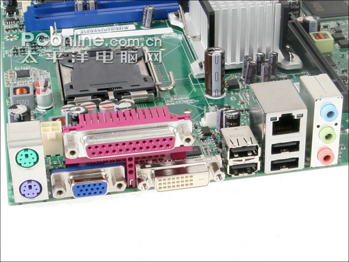 Intel G41TY主板的背部I/O接口部分,视频接口方面提供了一个VGA接口和一个DVI接口,虽然G41芯片组支持DisplayPort接口,但是在这款主板上并没有提供。
