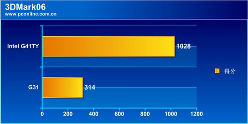 由于G31芯片组不支持DX10,所以在完全针对DX10进行测试的3DMark Vantage中得分为0,在这一测试中也准确的反应了G41芯片组相对于G31芯片组的一个很大的进步:支持DX10。在3DMark 06的测试中,我们可以看到G41的得分远高于G31,是G31主板得分的3倍多,对于定位相同的新老两代主板来说,这样的差距是很惊人的。
