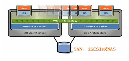 通过VMware VMotion可以实现虚拟机的动态迁移,而服务不中断。零宕机时间,进行有计划的服务器维护和升级迁移工作负载,资源利用率最大化。支持Fibre Channel和iSCSI SAN以及NAS环境。