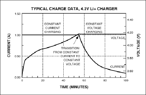锂离子电池标称电压3.7V(3.6V),充电截止电压4.2V(实际上锂电池的截止电压根据电芯材料决定,不同的材料体系截止电压略有区别)。标准的充电过程应该是首先恒流充电,即电流恒定,而电池电压随着充电过程逐步升高,当电池端电压达到4.2V(4.1V),改恒流充电为恒压充电,即电压恒定电流随着充电过程的继续逐步减小,当减小到0.01C时,认为充电终止。(C是以电池标称容量对照电流的一种表示方法,如电池是1000mAh的容量,1C就是充电电流1000mA,0.01C就是10mA。)
