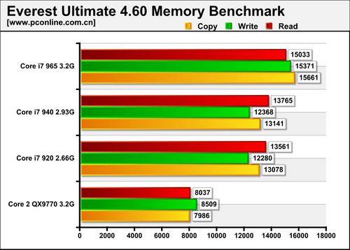 自从AMD的K8处理器集成内存控制器后,内存性能便一直成了Intel CPU的弱项。今天,Core i7要给这个弱项画上句号了,集成内存控制器后,同频的Core i7比Core 2 Quad提升接近100%。