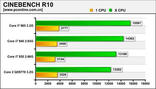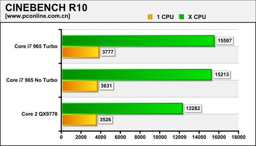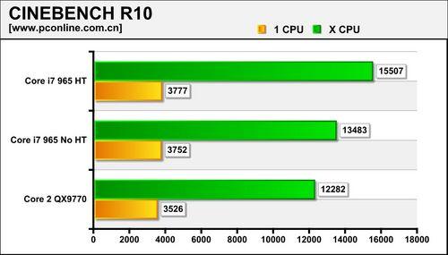 在CINEBENCH R10的测试中,单线程渲染时,Core 2 QX9770处于Core i7 940与965之间。当进行多线程渲染时,Core i7以8个线程同时渲染,表现相当出色,只有4个线程的QX9770只能垫底了。