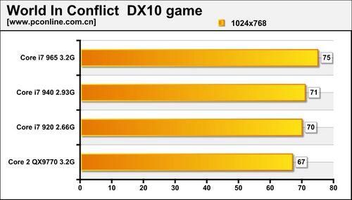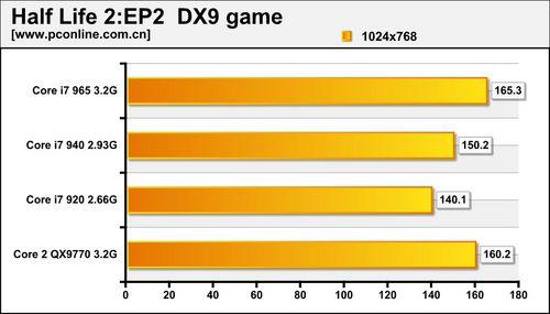 同样为DX9游戏,Core i7 QX9770成绩处于Core i7 965与940之间。半条命2作为一个单线程游戏,高频的CPU优势更为明显,因此已不能真实反映现在多核CPU的性能,在默认启动Turbo Boost技术的情况下,频率达到3.33G的Core i7 965领先于QX9770。