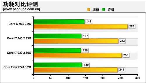 从测试结果来看,出现比较有趣的情况,Core i7 920与940,居然是频率更低的920功耗更高,我们经过反复测试均是此结果。Core i7 965比Core 2 QX9770高出10%左右的耗电量,而性能提升是达到了30%,也就是说Core i7能提供更好的能耗比/每瓦特性能。