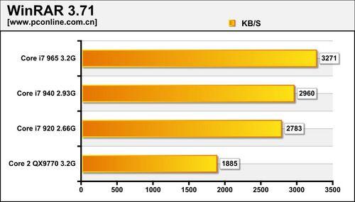 在WinRAR的评测中,集成内存控制器+三通道+超线程的Core i7锋芒毕露,大幅度抛离Core 2 QX9770。