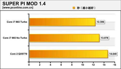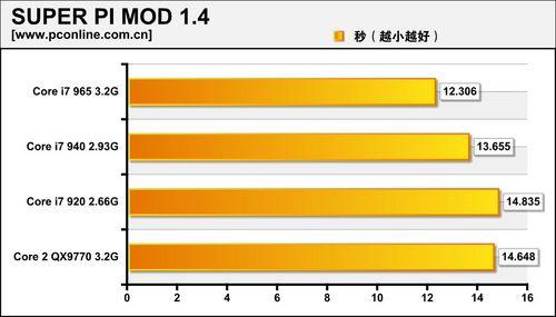在Super PI的测试中,Core i7家族的表现较为出色,940已领先Core 2 QX9770一秒多,965更是领先两秒。在SUPER PI接近10秒关口之际,一秒的差距是不少的。