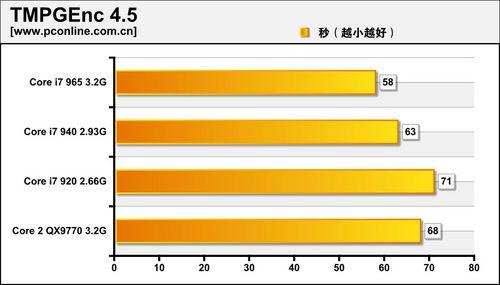 在我们的首发评测中,Core i7在TMPGEnc这个测试项目表现异常,原因是超线程与软件存在兼容性问题。本次测试采用最新版的软件,解决了该问题,Core i7的表现较为满意。