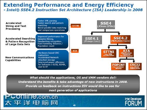 完整的SSE 4(Streaming SIMD Extensions 4,流式单指令多数据流扩张)指令集共包含54条指令,其中的47条指令已在45nm的Core 2上实现,称为SSE 4.1。SSE 4.1指令的引入,进一步增强了CPU在视频编码/解码、图形处理以及游戏等多媒体应用上的性能。其余的7条指令在Core i7中也得以实现了,称为SSE 4.2。SSE 4.2是对SSE 4.1的补充,主要针对的是对XML文本的字符串操作、存储校验CRC32的处理等。