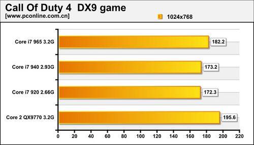 在使命召唤4的评测中,在相对于首发评测更成熟的条件下,Core i7仍不敌Core 2 QX9770,原因可能与CPU架构有关。当然,在主流分辨率下,主要考验的是显卡性能。