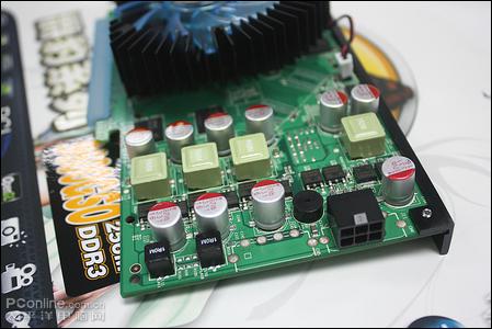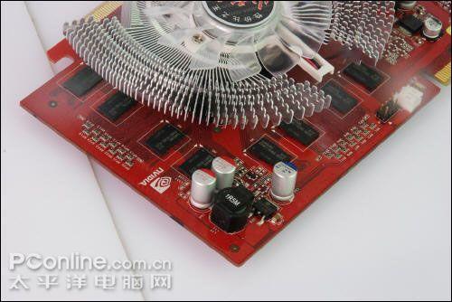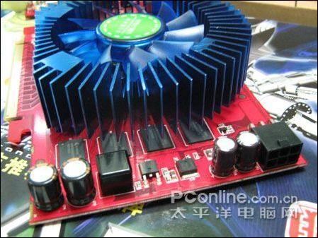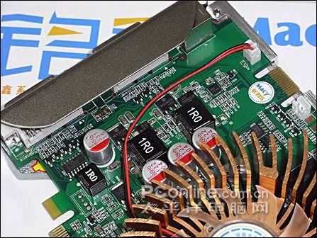 供电部分,铭鑫 9650GT 视界风追风版采用了核心与显存分体式供电,核心2相+显存1相,均采用富士康L8固态电容搭配全封闭式电感,让显卡的运行更加稳定,对于中低端的9500GT,这样的供电设计已经绰绰有余了。