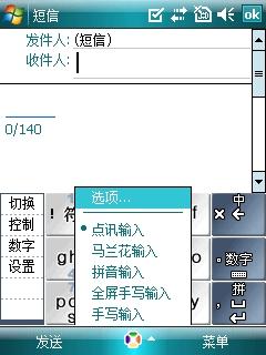 短信界面、拨打电话和电话簿界面都跟WM6系统的手机一样,这里就不多说了。在输入法上内置了点讯输入、马兰花输入、拼音输入等。