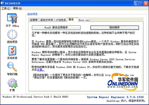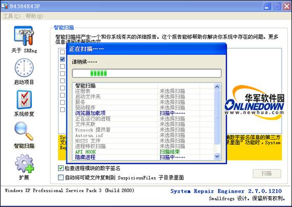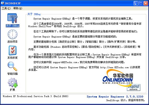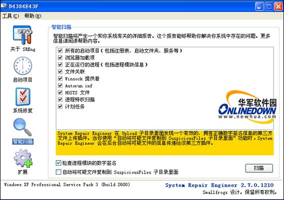 在System Repair Engineer(SREng)的帮助下,可以自己诊断操作系统里面可能存在的普遍性问题,即使是计算机初学者,也可以使用System Repair Engineer(SREng)的智能扫描功能将系统的概况生成一份简要的日志,然后将该日志传送给对操作系统熟悉的朋友或网友,在他们的帮助下解决您系统可能存在的问题。