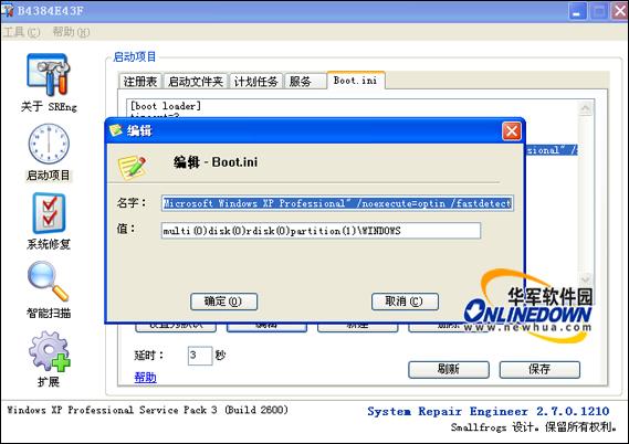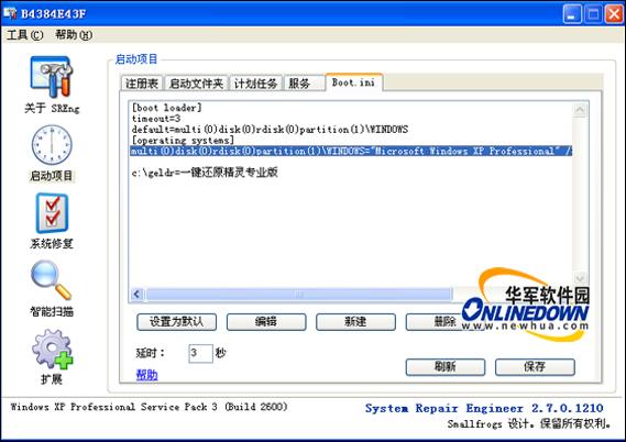 Boot.Ini作为一个重要的文件,在Windows启动过程中有着重要的意义,针对用户不知道Boot.Ini文件在哪和不知道如何编辑的问题,System Repair Engineer提供了一个编辑窗口用于配置Boot.Ini ,System Repair Engineer允许用户对Boot.Ini采取新建、删除、编辑、设置默认启动项、设置延时等操作。如图9所示。