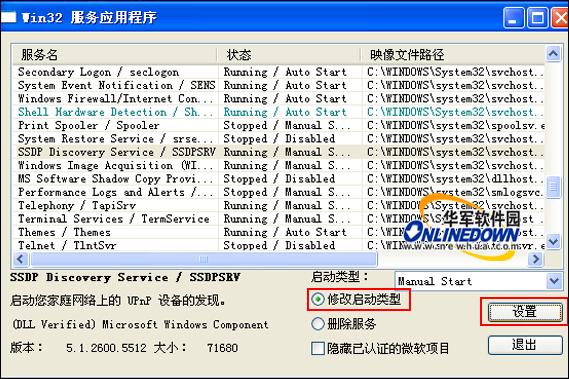 如果你想改变一个服务的启动类型,只需执行以下步骤就可以完成:首先选择一个服务项目;然后在界面下方选择一个启动类型,选中“修改启动类型”最后点击“设置”按钮。如图8所示。