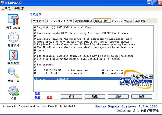 System Repair Engineer提供了对Hosts文件的配置,管理功能。用户可以新建/删除/编辑/注释Hosts文件记录。而无需在Windows安装目录里面寻找Hosts文件,以简化操作。如图13所示。