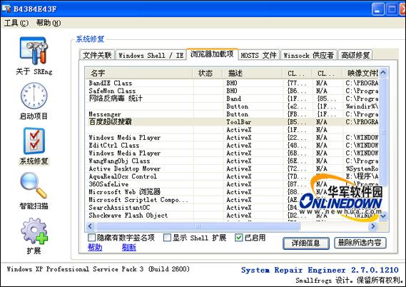浏览器加载项是目前大多数“流氓软件”使用的一种自我加载方法。由于浏览器加载项在系统里面进行了注册,手工清除多有不便,而且浏览器不完善的加载项会导致Internet Explorer或Windows资源管理器崩溃,因此需要能够删除不需要的浏览器加载项。System Repair Engineer 增加了浏览器加载项管理功能。提供了删除/禁用/查看浏览器加载项等功能。另外,还额外提供了显示 Shell 扩展内容的功能。如图12所示。