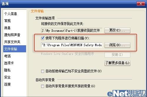 除此之外,为了防止病毒木马通过下载进入系统,MSN保护盾还自动接管了Windows Live Messenger的文件传输模块。当我们点击“工具”菜单→“选项”窗口,便可以看到“文件传输”标签下,原本空空如也的“病毒扫描模块”,如今已经变成了MSN保护盾的查杀模块。一旦软件发现被传输的文件中包含病毒,便会通过一个对话框,提醒用户处理。而在这个过程中,当前下载将被立即挂起,绝不会出现病毒文件在没有得到明确的处理指令之前,下载到硬盘之上。
