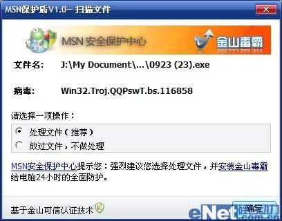 和网址测试相比,MSN保护盾的文件测试成绩,就没有那么扎眼了。从测试情况来看,随着MSN保护盾的入驻,Windows Live Messenger能够自动识别并拦截出大部分病毒文件。但仍然有部分样本,没有被软件检出。而当我们使用最新版本的NOD32,继续对下载文件夹手工查毒时,仍然可以轻松地扫描出剩余的病毒样本。显然,MSN保护盾的病毒查杀能力,还是与主流杀毒软件,存在一定的距离。