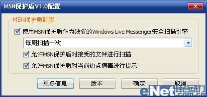 【小提示】 在默认情况下,内存扫描每周进行一次。如果您感觉这个设置不太满意,也可以自行打开Windows Live Messenger的“工具”菜单→“MSN保护盾V1.0配置”一项,手工进行设置。