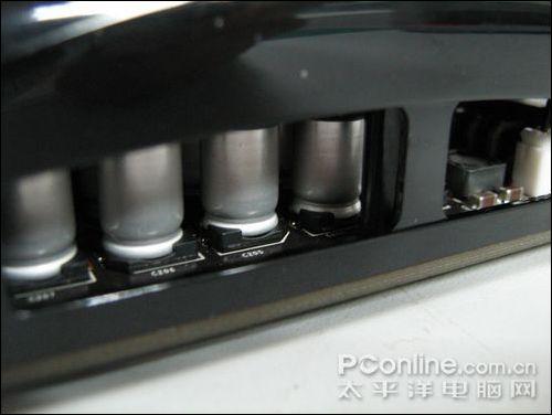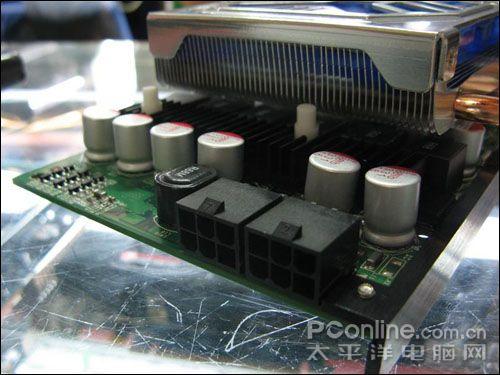 供电部分上,9800GTX+ 终结版采用了很少见的4+2相供电设计,搭配优质全固态富士通电容,保证在高频率下显卡的稳定运行;另外还提供了双6PIN的外接电源接口,为显卡提供强劲稳定的动力,这样扎实而且强大的设计,让这款显卡性能更加强悍,比公版更是强上不少。