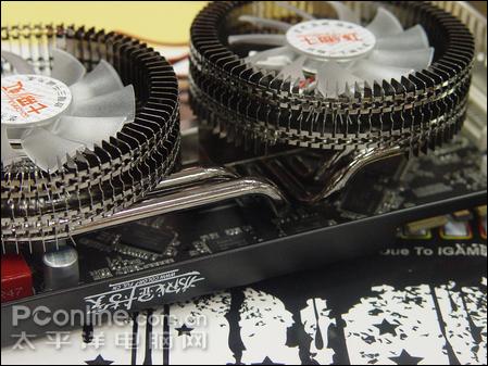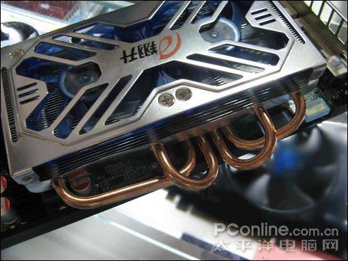 散热部分,仍然采用了强悍的四热管双风扇散热系统,散热器引入了4根铜导热管,配合密集的铝制散热片,可以充分利用铜和铝各自的特点,迅速将热量导出,彻底解决散热问题。