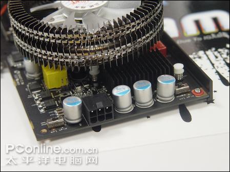 Inno3D 9800GTX+显卡采用了4+2相供电模式,并且使用了全封闭电感和全固态电容,Mosfets管被散热片所覆盖,在显卡工作时,显卡上的风扇带起的风也同时能够帮助Mosfets管进行散热,这样的设计让显卡在获得充足、稳定的电流供应的同时,供电单元还能够有一个温度较低的良好工作环境。提供双6PIN电源接口,支持3路SLI。