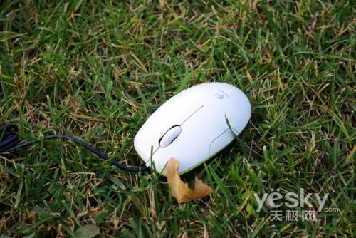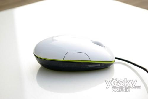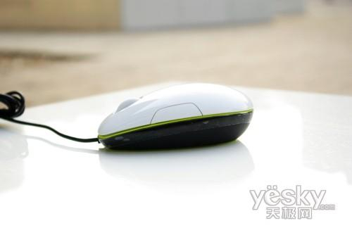 鼠标的上半部分为白色抛光材质,下半部分采用黑色材质。在两种材质间有绿色的腰线隔开。单单如果设计为黑白相间似乎有些单调,配合绿色腰线能够带来额外清新的感觉。