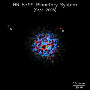美国加利福尼亚州劳伦斯—利弗莫尔国家实验所的天文学家拍摄到的一组多行星系统红外照片是利用双子北座望远镜和夏威夷冒纳凯阿山顶天文台。只见3颗气态行星环绕一颗距离地球约130光年的恒星HR8799运行。这3颗行星的质量约为太阳系最大行星木星的7~10倍,分别以450年、180年和100年的周期环绕HR8799逆时针运转。HR8799的质量约为太阳的1.5倍。科学家将它们组成的行星系统称为HR8799星系。