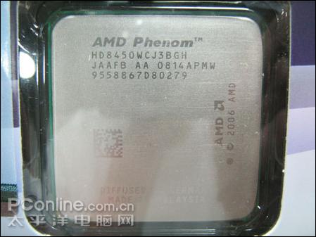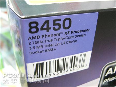 AMD Phenom X3 8450处理器采用了AMD最新的一拉即开整体嵌入式包装,处理器的核心名称为Toliman,采用65nm工艺制程,TDP功耗值为95W,支持Hyper Transport 3.0,采用AM2+接口,同样是940针,可以兼容上一代AM2接口的主板。AMD Phenom X3 8450处理器的编号为“HD8450WCJ3BGH”。