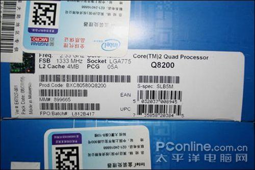 Intel Core 2 Quad Q8200/盒装处理器外采用LGA 775接口,主频为2.33GHz,共享达4MBytes的二级缓存,前端总线频率为1333MHz。处理器的产品编号为BXC80580Q8200,批次号为L812B417,版本序列号为E47327-001。