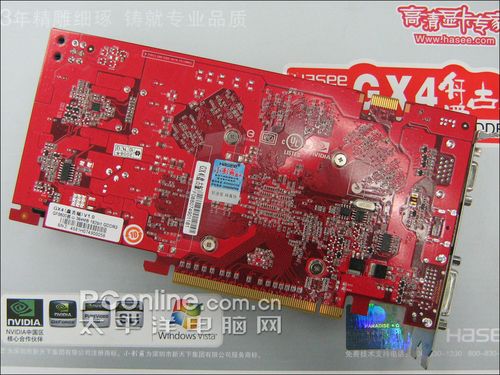 小影霸 GX4盘古版由6颗容量为64M的显存颗粒,组成384M/192bit显存规格,核心及显存频率达到650/2000MHz。