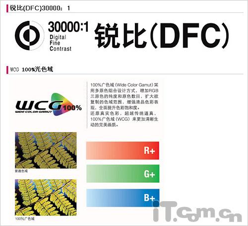打开LG L227WTP的官方网页,我们看到了L227WTP的两大特点DFC 30000:1和WCG 100%广色域