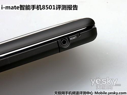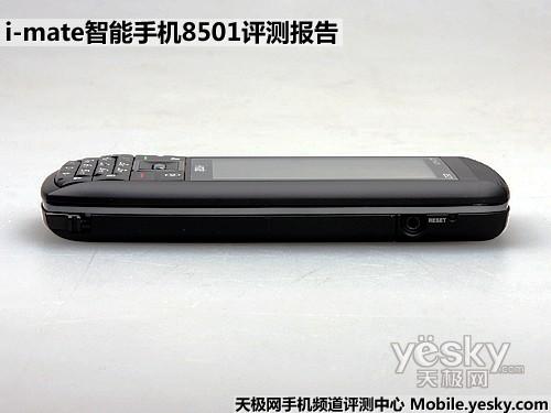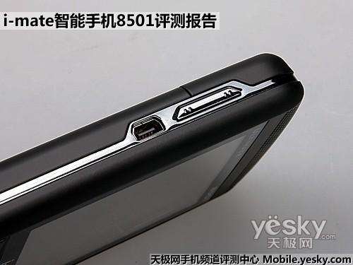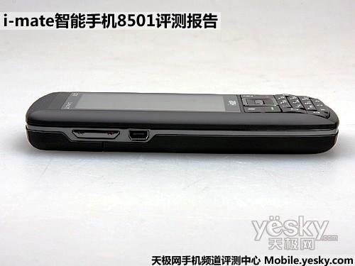 i-mate 8501的机身四周的接口和按键还是设置的比较合理,本着使用的原则,机身左侧设置了一个音量调节键以及MiniUSB通用接口,用来连接数据线、充电器以及耳机等外接设备。