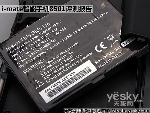 i-mate 8501随机搭载了一块1080毫安锂离子电池,不大的电池容量对于一款采用高主频CPU、大尺寸触摸屏的智能手机来说,有点吝啬,在经过实际的评测,平均每天30条短信、20分钟电话、30分钟其他操作的情况下,只能待机2天左右的时间,待机表现不是很理想。