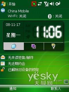 i-mate 8501采用了全新的Windows Mobile 6.1智能操作系统,在待机界面下,除了基本的显示时间、日期、信号等信息以外,还支持自定义桌面控件功能,可以把自己想要的快捷项目放到桌面上来。