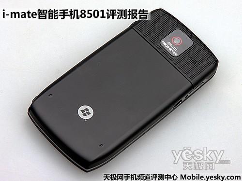 i-mate 8501的机身背面非常朴实,大面积的黑色面板采用了细磨砂处理,增加了手与机身的摩擦力,以提高手机的手感。
